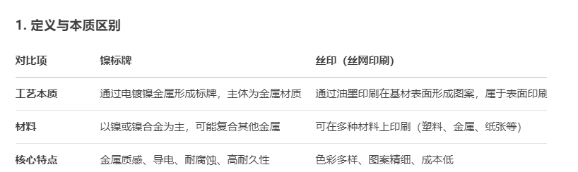 鎳標(biāo)牌和絲?。ńz網(wǎng)印刷)是兩種完全不同的工藝,用途、制作方式和最終效果都有顯著區(qū)別。以下是它們的核心差異對(duì)比:
