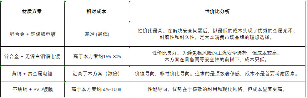 免責(zé)聲明: 本方案完全基于您所提出的“鎳材質(zhì)經(jīng)過(guò)環(huán)保驗(yàn)證,無(wú)過(guò)敏風(fēng)險(xiǎn)”這一核心前提。在實(shí)際應(yīng)用中,建議務(wù)必向終端品牌方清晰傳達(dá)并提供相應(yīng)的環(huán)保認(rèn)證文件,以確保信息透明和商業(yè)合規(guī)。